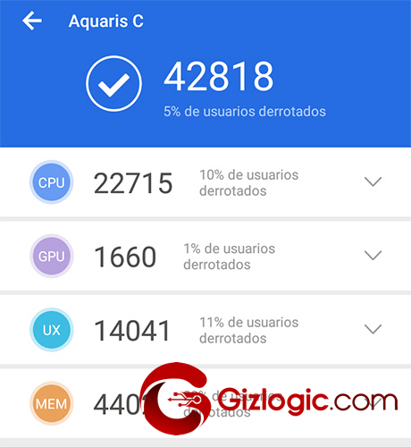 El rendimiento diario del terminal ha sido fluido durante el tiempo que lo hemos usado. Aunque debemos tener en cuenta que estamos hablando de un teléfono de gama baja. No se le puede exigir mucho al procesador Qualcomm® Snapdragon™ 425, con sus cuatro núcleos trabajando a 1,4 GHz. Máxime teniendo el modelo solo 2 GB de RAM. Para conocer los límites reales del terminal, lo hemos sometido al test de AnTuTu. Los resultados tienen poco que comentar.