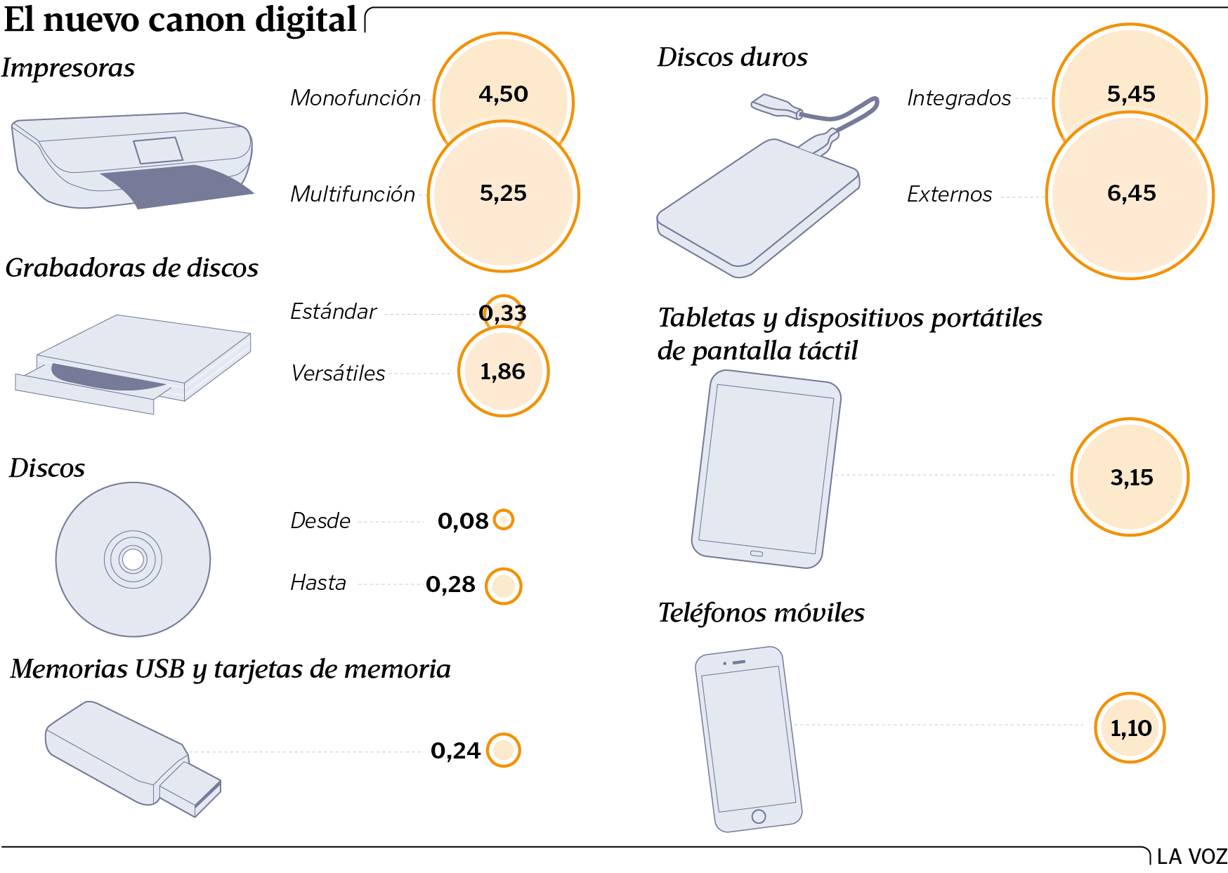 - Discos que reproduzcan contenidos: Los discos no integrados reciben un recargo de 6,45 euros, mientras que el canon para los discos integrados en equipos es de 5,45 euros. No aplica a discos de consolas de videojuegos ni a decodificadores de TV.