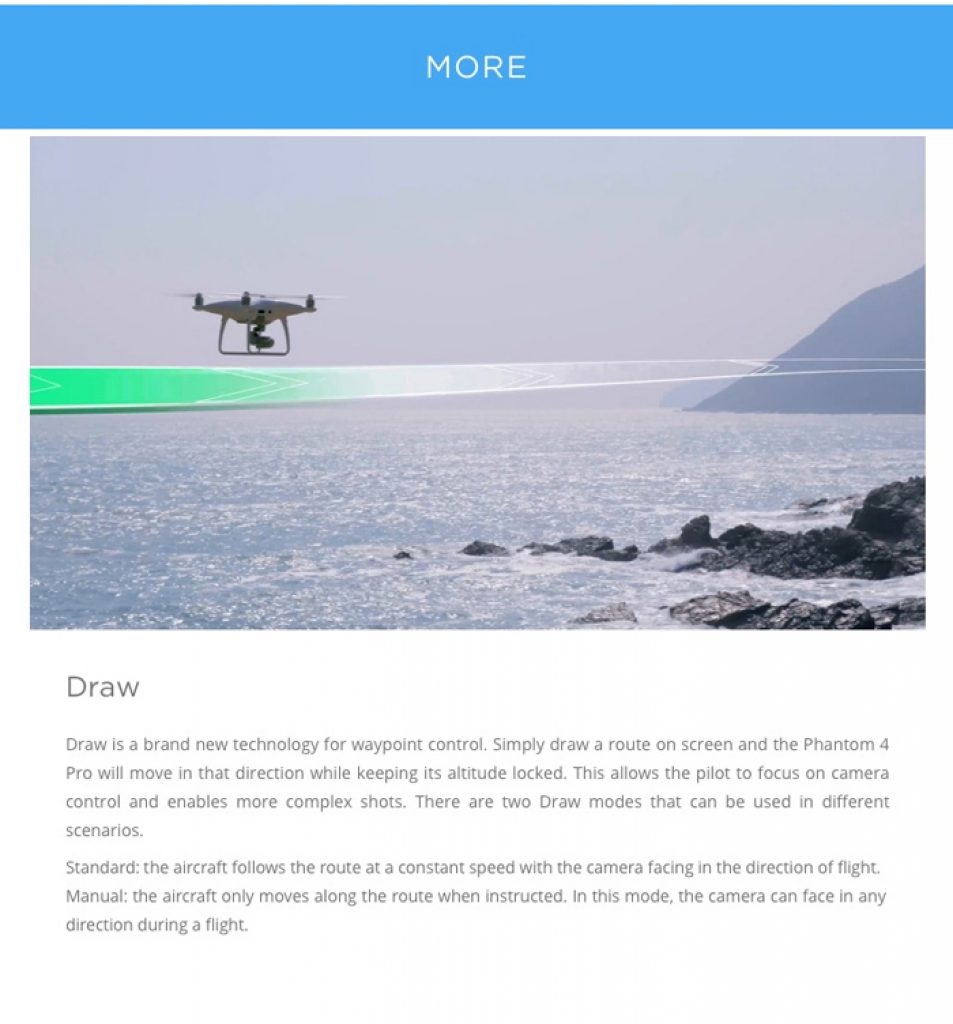 Otra de las funcionalidades más llamativas, que no se encuentra en otros drones DJI Phantom, es el modo de vuelo inteligente conocido como Draw Mode. Este le permite al piloto dibujar mediante una serie de líneas, una dirección en la pantalla del controlador y después hacer que el DJI Phantom 4 Pro tome ese camino.