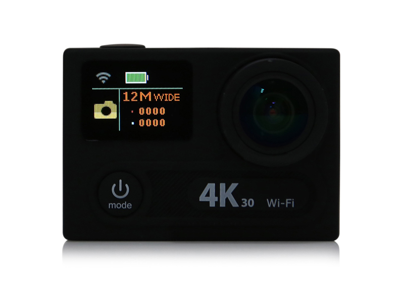 EKEN incorpora 2 pantallas a su cámara deportiva, una delantera para datos – función y una trasera de visualización en vivo – galería. En el frontal tenemos la óptica de la cámara, el botón de encendido y la serigrafía de la marca. En el lateral derecho tenemos el altavoz, la ranura para tarjetas microSD, puerto microUSB de carga/lectura de contenidos y conector mini HDMI; todo esto sin ningún tipo de tapa para evitar que entre polvo. El lateral izquierdo se reserva para el botón de conexión WiFi y en el lateral superior tenemos el micrófono y el botón de encendido – captura.