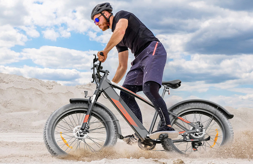 La ELEGLIDE Tankroll sin lugar a dudas se perfila como una bicicleta de montaña particularmente robusta, montando sobre neumáticos gruesos de 26 x 4 pulgadas de la marca CST, los cuales están hechos para garantizar estabilidad y buena tracción en cualquier tipo de terreno. La rueda delantera incluso está acompañada por suspensión, haciendo posible recorrer esos caminos con relativa comodidad.