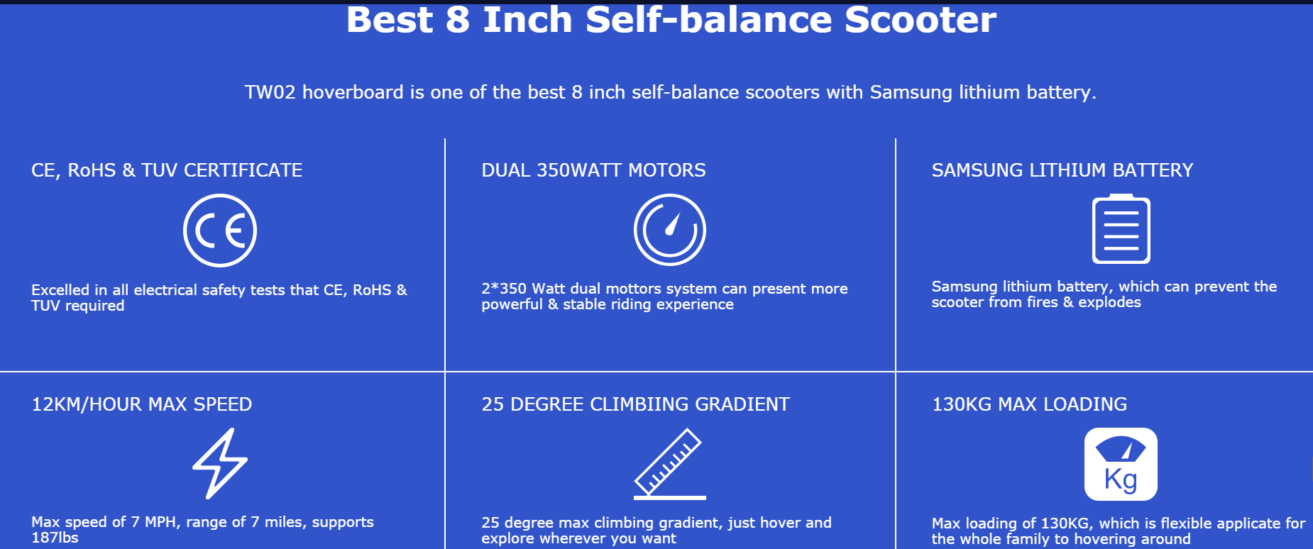 ¿Qué podemos esperar del Megawheels TW02? Si nunca has oído hablar de este hoverboard barato, a continuación te hacemos un resumen rápido de sus principales características. Por un lado, se trata de un self-balance de 8 pulgadas, lo cual mejora la estabilidad del dispositivo sin comprometer el aspecto de la velocidad. Actualmente, existen tres tipos de tamaños de ruedas (6.5″, 8″ y 10″), siendo las de 8″ las preferidas por la mayoría de usuarios por su excelente versatilidad.