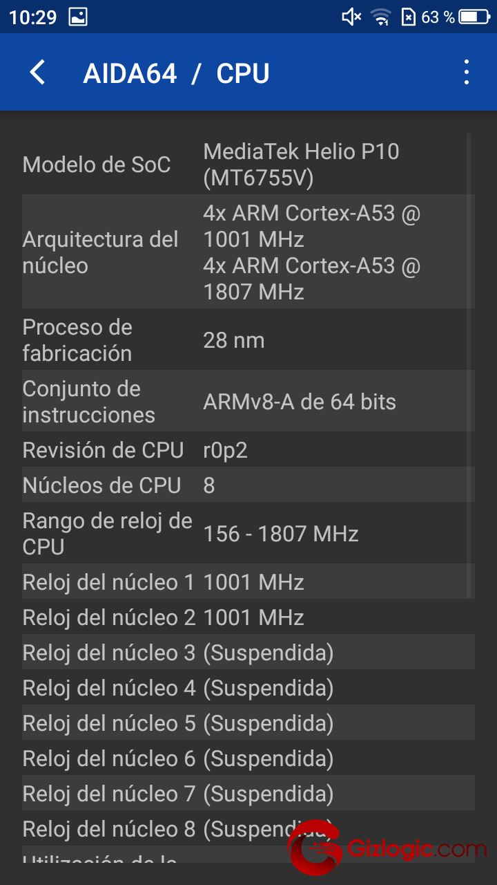 CPU MediaTek Helio P10 / 8 núcleos a 1,8 GHz máximo