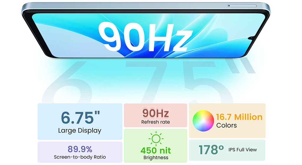 En la parte frontal podemos esperar una pantalla de 6.75 pulgadas con una típica resolución HD+, pero se compensa con una tasa de refrescamiento de 90Hz, un brillo de 450 nits y una relación pantalla-cuerpo del 89.9%.