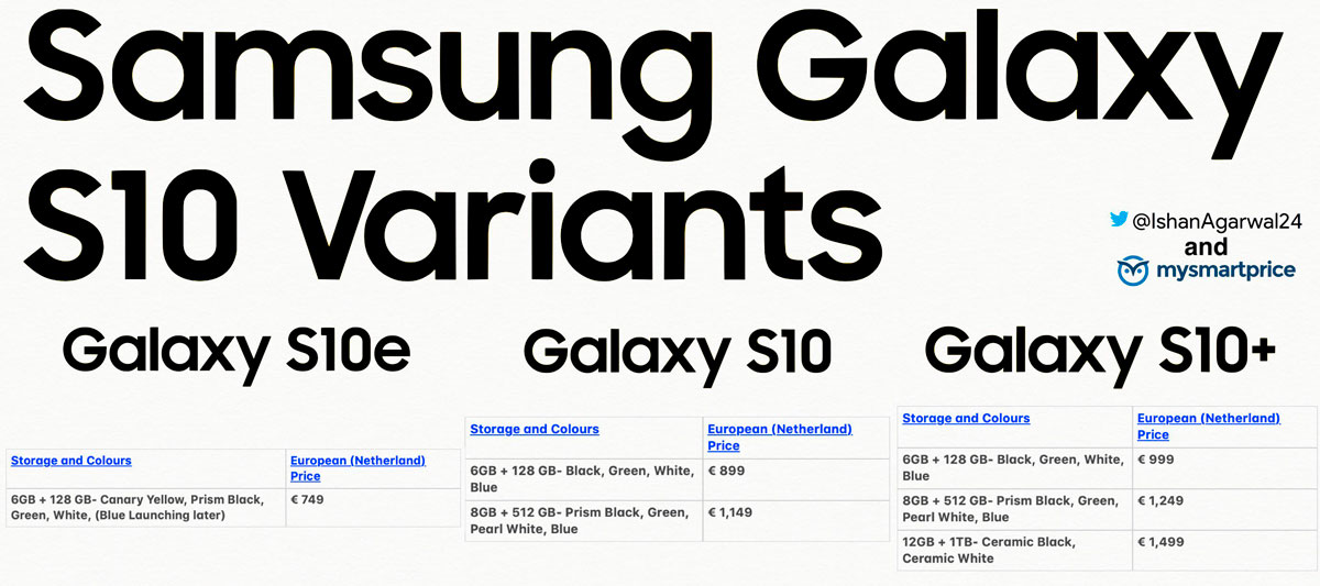 El modelo más modesto y económico sería el Samsung Galaxy S10e, con una combinación de 6 GB de memoria RAM + 128 GB de almacenamiento interno, por un precio de 749 euros. Además, estaría disponible en cinco colores (amarillo, negro, verde, blanco y posteriormente en azul).