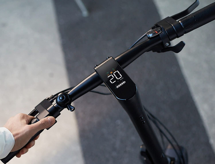 Por último, el centro del manubrio es hogar de una pantalla LED que sirve para indicarnos en tiempo real la velocidad actual, el modo seleccionado, la distancia recorrida y, por supuesto, la carga restante de la batería. Adicionalmente, la pantalla se ajusta automáticamente a la iluminación ambiental, por lo que no debería haber problemas de visualización.
