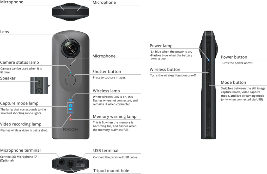 Además, en los extremos de la Ricoh Theta V esta cuenta con dos lentes ubicados de manera opuesta que son los que permiten conseguir la magia de la filmación en 360 grados. Debajo de uno de estos lentes se encuentra el botón del obturador, así como algunos indicadores LED que permiten saber si el Wi-Fi está encendido, así como conocer si se está en modo de fotografías o vídeos. De igual manera, en uno de sus bordes delgados cuenta con tres botones pequeños que sirven para encender el dispositivo, activar el Wi-Fi y cambiar de modo entre fotos y vídeos. La parte inferior del dispositivo tiene un puerto micro-USB, un montaje de tornillo para trípodes y un conector para micrófono.