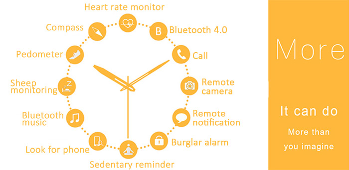 - Funciones principales: agenda de contactos, hacer y contestar llamadas, mensajes, control remoto de cámara y música, mando a distancia por infrarrojos, monitor de sueño, podómetro, sensor de frecuencia cardíaca, recordatorio de sedentarismo, notificaciones, alarmas, brújula.