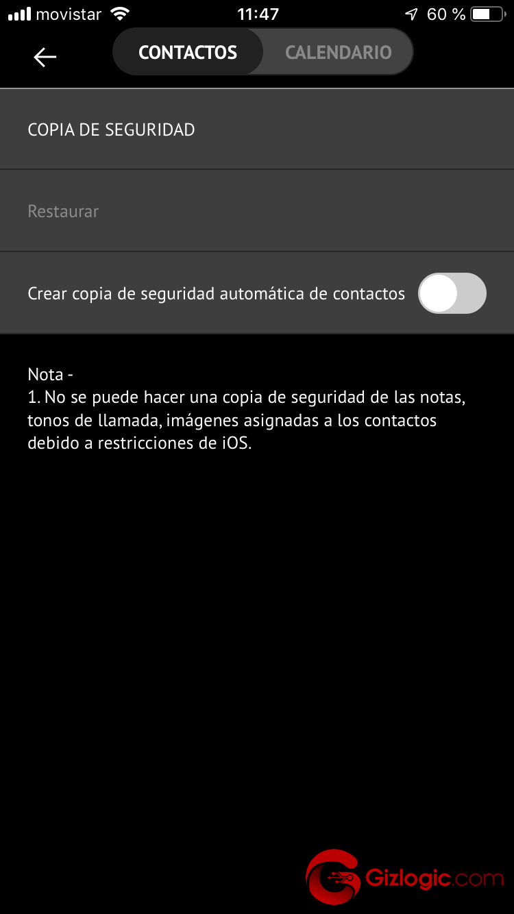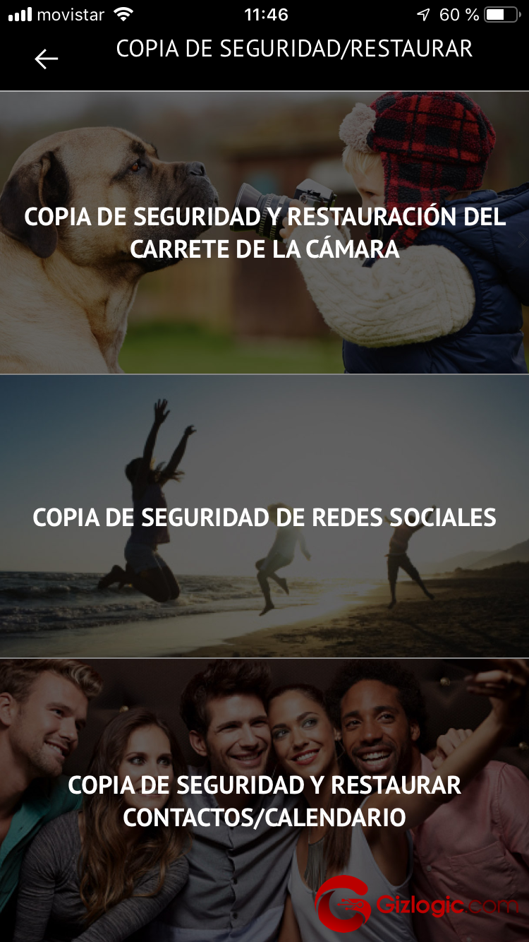 Estas son las interfaces de cámara, redes sociales y contactos. Simplemente deslizar el botón y podremos despreocuparnos ya que la siguiente que conectemos el dispositivo la copia se realizará automáticamente.