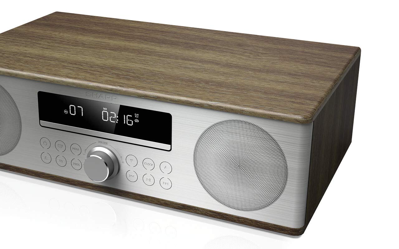 Este Sharp XL-B710 destaca por su elegante y compacta carcasa de madera y un panel frontal de acero inoxidable mecanizado.