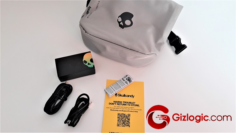 Junto a los cascos Skullcandy Crusher Evo se nos entrega: el cable de carga USB / USB-C, de aproximadamente 60 cm de largo; un cable auxiliar, jack 3,5 mm de aproximadamente 1,2 m de longitud; varios documentos, entre ellos un pequeño manual; y una practica funda de transporte, con un forro interior supersuave y dos bolsillos internos.
