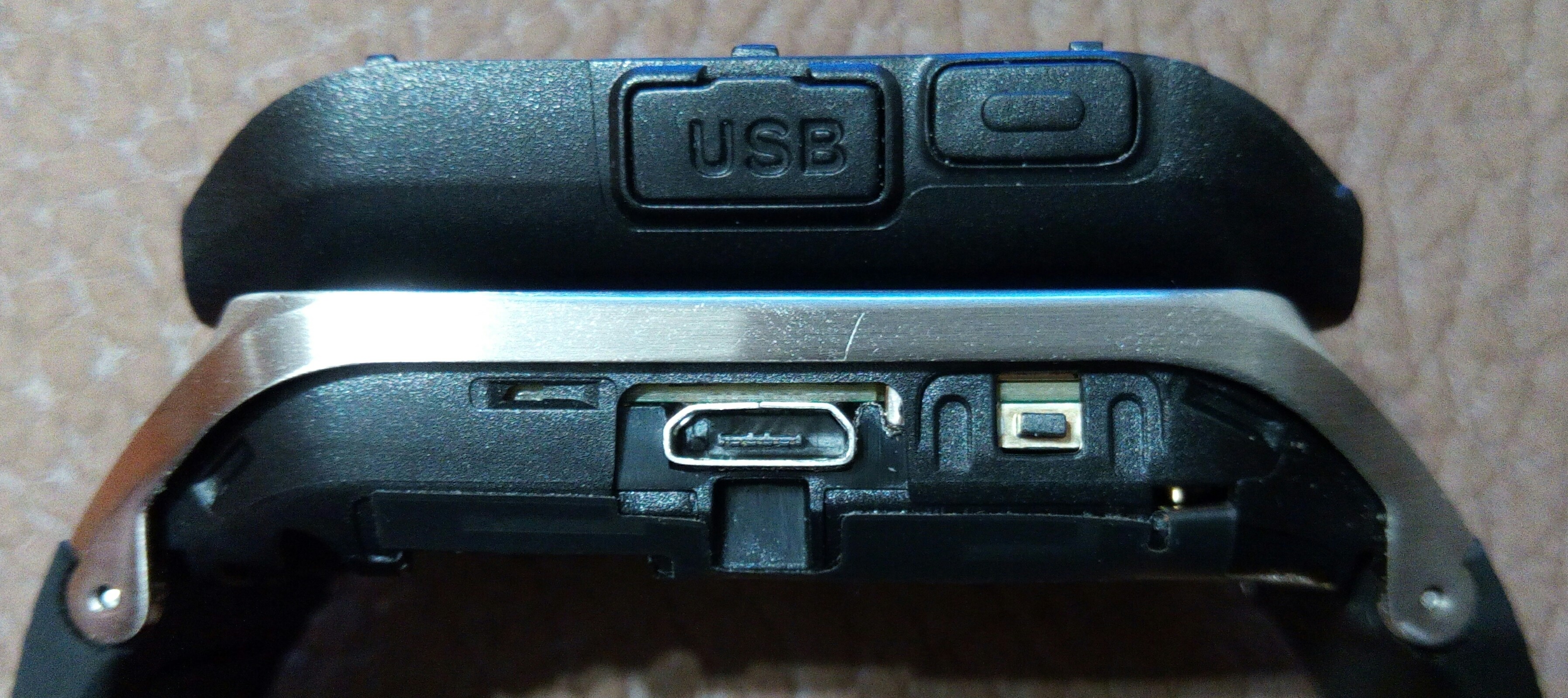 Aquí tenéis una foto en detalle con la tapa trasera del smartwach GV18 retirada, dejando al descubierto el puerto USB y el botón de encendido.