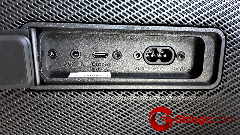 El panel de conectores se ubica en la parte trasera del Stormbox Blast protegido bajo una tapa de goma flexible. Tiene las opciones mínimas: un puerto USB; un jack de entrada auxiliar; y la toma de corriente.