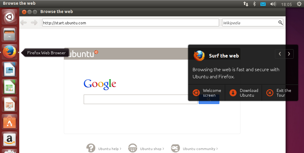 Como su propio nombre indica, y como ya intuiréis, Ubuntu Tour nos permite hacer un recorrido por Ubuntu en línea, sin instalarlo. Basta con ingresar una dirección en nuestro navegador web preferido y listo (o pinchar directamente aquí): se nos mostrará el escritorio de Ubuntu con su más que reconocible fondo de pantalla, a la izquierda encontraremos Unity, su controvertida barra de menús lateral, y en la parte de arriba podremos inspeccionar su panel superior con la hora y fecha, correo, bluetooth, etc.
