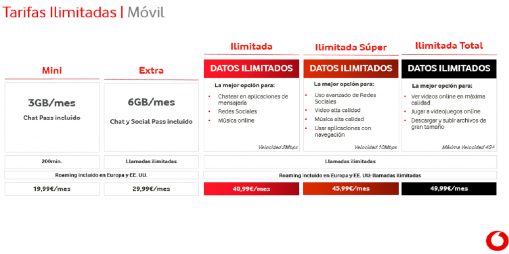 - Ilimitada súper: Mismo principio que la anterior, pero con una velocidad de 10Mbps y un precio de 45,99. Asimismo, ofrece 17GB al mes para roaming de datos.