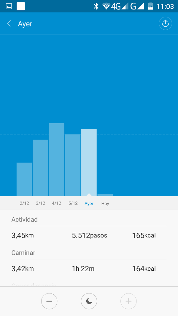 Con una estructura igual al tema del sueño, en el apartado de la actividad física podemos ver en un vistazo rápido los pasos que llevamos hoy andados, la distancia y los kilómetros.