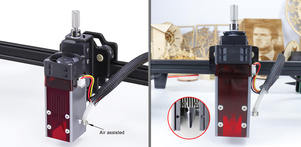 En otro orden de ideas, la máquina soporta asistencia de aire para lograr una mayor eficiencia, velocidad y mejores acabados a la hora de tallar. No obstante, es importante destacar que ninguna versión de esta máquina incluye la bomba de aire, solo la boquilla y el resto de los componentes necesarios, así que queda de parte del usuario conseguir una.